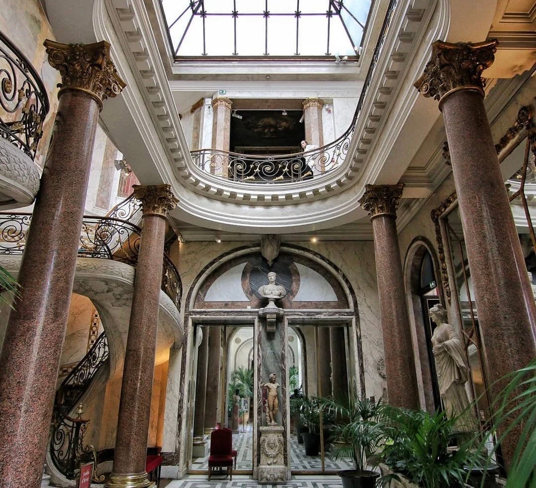 The museum’s many drawing rooms and galleries are each furnished in the refined style of the French aristocracy, with everything from silk wall coverings to painted ceilings. A sweeping double staircase commands attention at the center of the house, and a plant-filled, glass-ceiling atrium showcases a collection of statues.