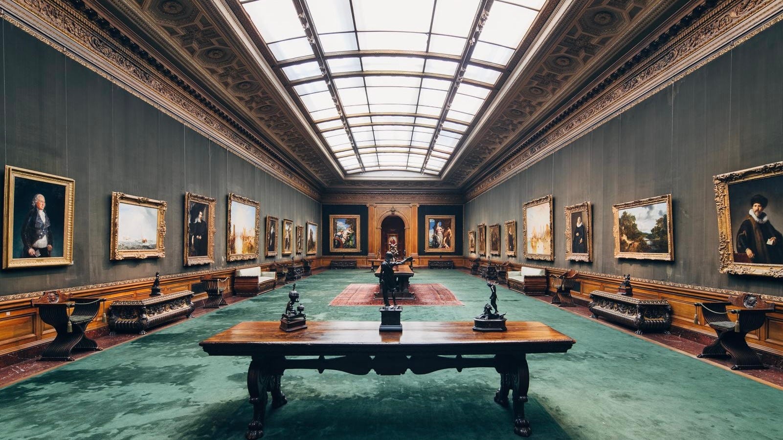 The galleries in the Frick feel more like drawing rooms than exhibition halls, as natural light filters through curtains while paintings by Vermeer, Titian, and Rembrandt hang above marble fireplaces. A quiet garden court opens near the main galleries, where a fountain trickles softly under the glass canopy.