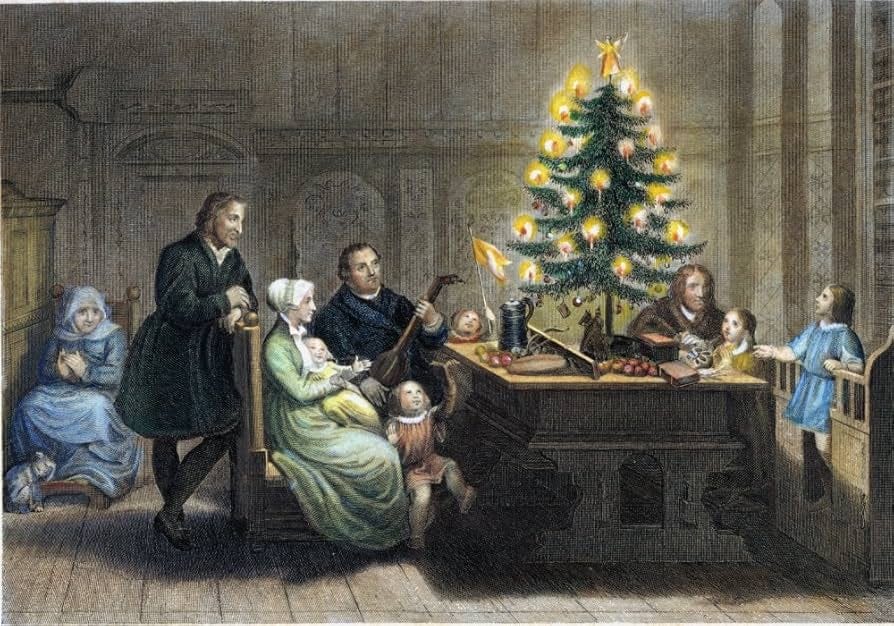 The third and final origin story comes from Reformation era Germany. According to an anecdote from none other than Martin Luther himself, the rebellious priest was walking through an evergreen forest on a winter night, when he was suddenly struck by the beauty of the stars shining through the branches. To recreate the scene, he placed candles on a tree inside his home. The tree was a reminder of the forest, yes, but to Luther it was also a visual reminder of creation, light, and the Incarnation.