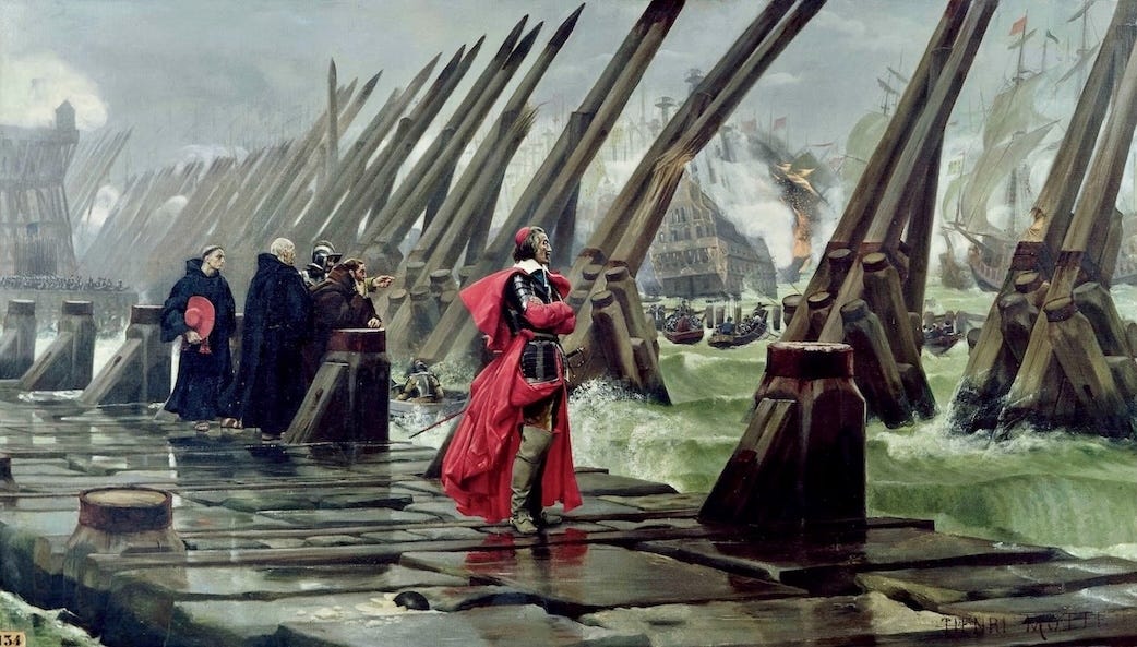 Motte’s stand-out work is probably “The Siege of La Rochelle” (1881), above. La Rochelle, one of the final strongholds of French Huguenots after a century of war against royal Catholic forces, was captured by Cardinal Richelieu after a marathon siege in 1628. Here he stands upon a sea wall built to block the harbor and isolate the city. Motte’s version of events, painted almost 150 years ago, could easily be mistaken for a still from a modern film.