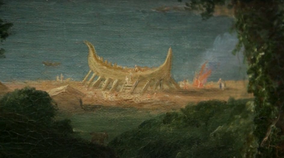 The stump of a felled tree on the right side of the painting is the first indicator. Whereas nature dominated man in The Savage State, man now strives to dominate nature. But what’s happening with the wood from the felled tree is even more interesting — a close look through the trees reveals a ship under construction. Though modest, it’s indicative of the civilization’s aspirations: expansion, trade, and conquest.