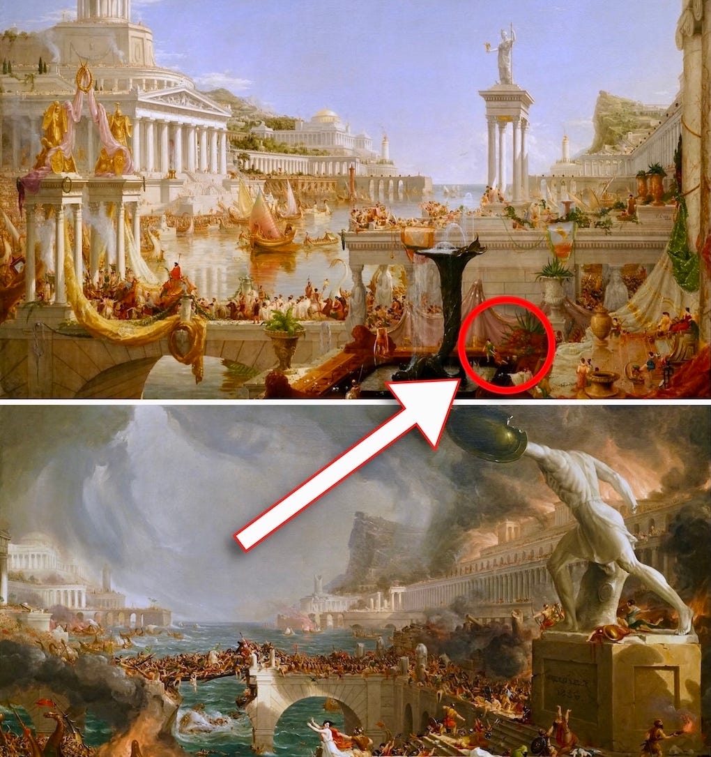 Cole’s answer is none of the above. To show what sows the seed of destruction in this empire — and in all empires — he includes one small detail in the painting. And it’s one you’d never see if you don’t know where to look…
