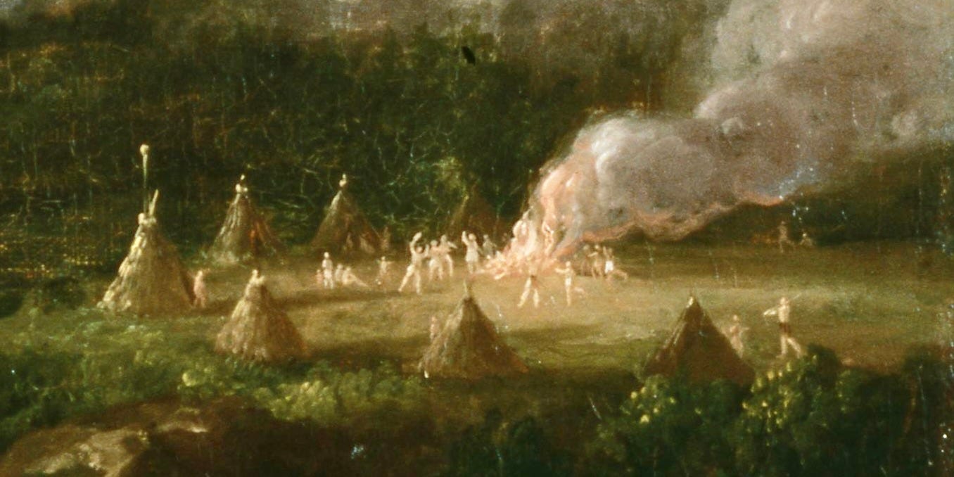 Cole begins his sequence with raw beginnings. The Savage State shows a wilderness under stormy skies, dense with forest and marsh. In the center of the painting a hunting party rushes forward, spears raised high as they chase their prey. Smoke curls from a fire where others dance on the right side of the frame, and where rudimentary huts mark the only sign of civilization.