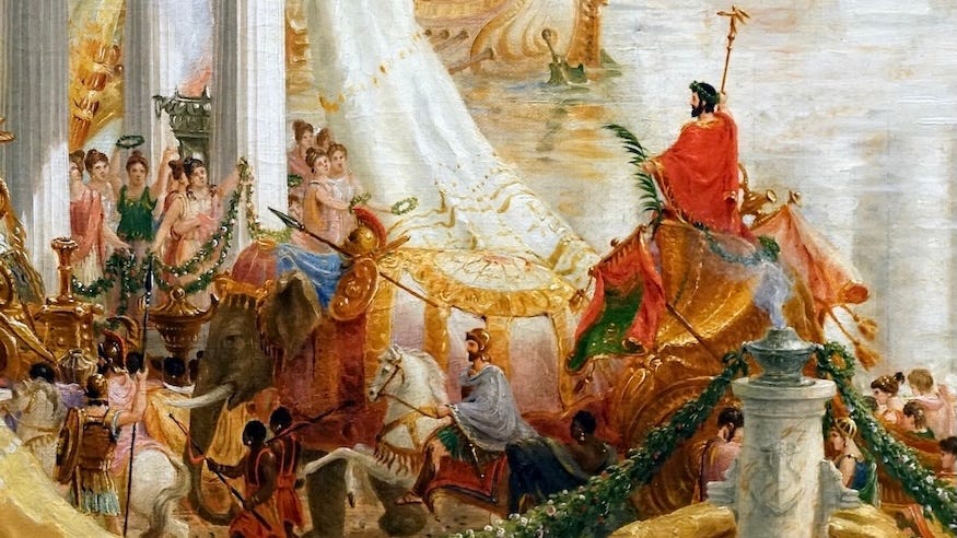 The central drama is a great procession reminiscent of Roman triumphs, which Cole describes as such: