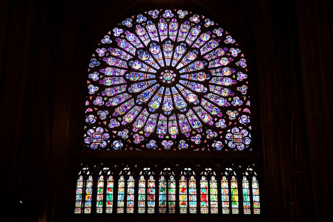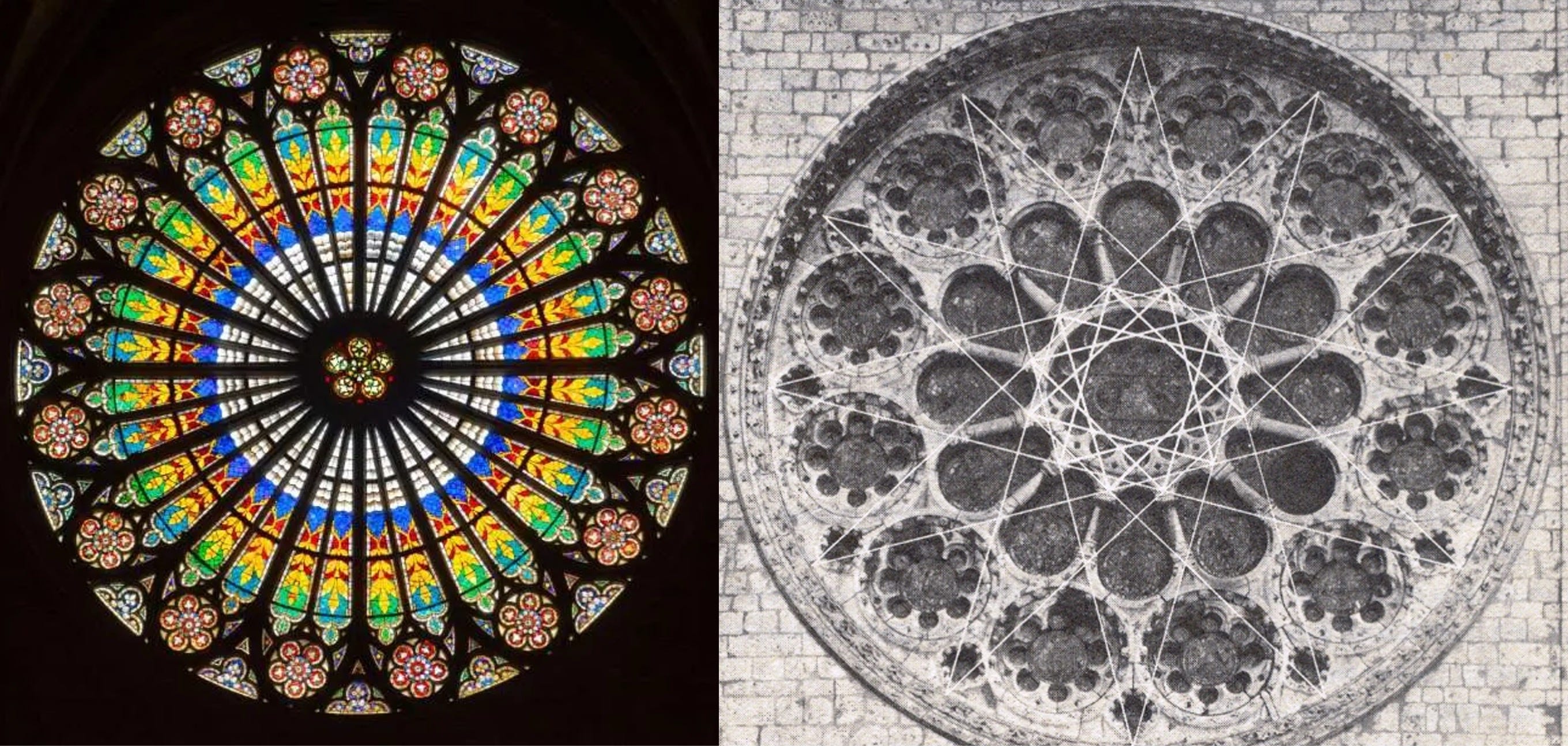Architects of the Middle Ages drew their inspiration from the harmonic structure of the universe. In his book, The Rose Window, artist Painton Cowen demonstrates that the northern rose window at Chartres Cathedral was created by superimposing three hidden geometries: the Fibonacci sequence, a spiral of equilateral triangles, and an integration of the first two. It is a thing of wild complexity.