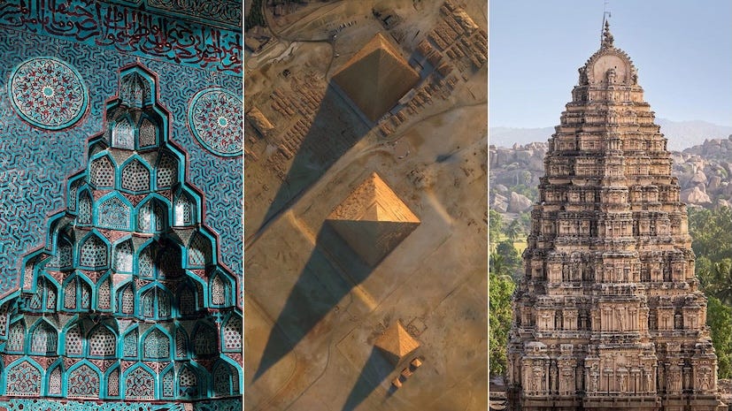 Islamic design incorporates complex geometric patterns, Egyptian pyramids use precise angles and proportions including the golden ratio, and Hindu temples use fractals as the basis for its high spires: