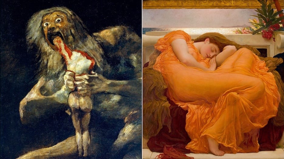 Take a look at these two paintings: “Saturn Devouring His Son” by Francisco Goya, and “Flaming June” by Frederic Leighton.